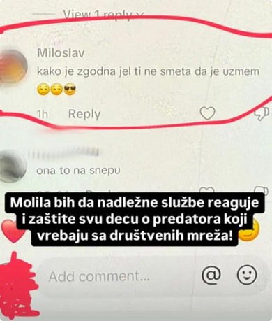 – Ljudi moji, važno obaveštenje. Pedofil sa TikToka, koji piše u komentarima na istom mom jedanaestogodišnjem detetu komentare o tome kako je zgodna! I na sve to i jedno muškom detetu koje se slika sa njom – da li može da je ukrade! Ukoliko neko zna ko je ovaj čovek, molim vas da mi se javi – istakla je Aleksandra, pa dodala: