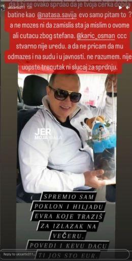-Spremio sam poklon i hiljadu evra koje tražiš za izlazak na večeru. Povedi i kevu, daću ti još sto evra – napisao je Osman uz fotografiju na kojoj nasmejan pozira.