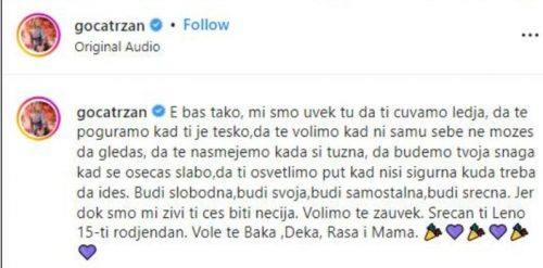 „E baš tako, mi smo uvek tu da ti čuvamo leđa, da te poguramo kad ti je teško, da te volimo kad ni samu sebe ne možeš da gledaš, da te nasmejemo kada si tužna, da budemo tvoja snaga kad se osećaš slabo, da ti osvetlimo put kad nisi sigurna kuda treba da ideš. Budi slobodna, budi svoja, budi samostalna, budi srećna. Jer dok smo mi živi ti ćeš biti nečija. Volimo te zauvek. Srećan ti Leno 15. rođendan. Vole te Baka, Deka, Raša i Mama“, napisala je Goca.