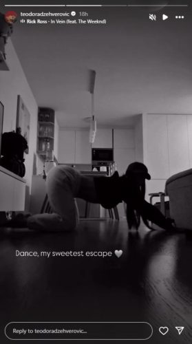 U snimku, Teodora igra zavodljivo, obučena u kratak top i trenerku, ističući savršenu figuru i izvanrednu fizičku spremnost.