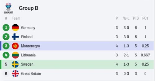 Na tabeli, Nemačka i Finska su maksimalne sa skorom 3-0, Litvanija ima 2-1, Crna Gora i Švedska 1-3, a Velika Britanija je bez pobede 0-3.