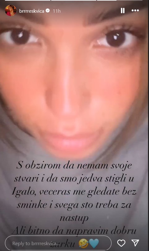 „S obzirom da nemam svoje stvari i da smo jedva stigli u Igalo, večeras me gledate bez šminke i svega što treba za nastup. Ali bitno da napravim dobru žurku“, napisala je ona na svom instagram nalogu.