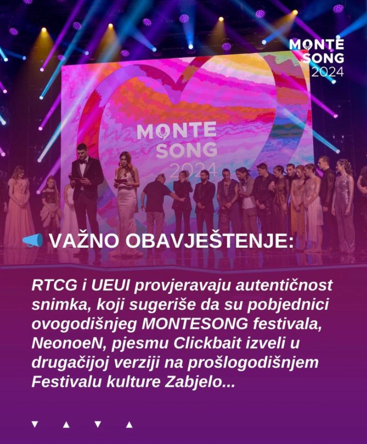 RTCG i UEUI proveravaju autentičnost snimka, koji sugeriše da su pobednici ovogodišnjeg MONTESONG festivala, NeonoeN, pesmu Clickbait izveli u drugačijoj verziji na prošlogodišnjem Festivalu kulture Zabjelo…