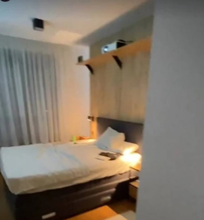 Iz prostranog dnevnog boravka se uskim hodnicima dolazi do spavaće sobe u kojoj se nalazi ogroman video-projektor i francuski ležaj.
