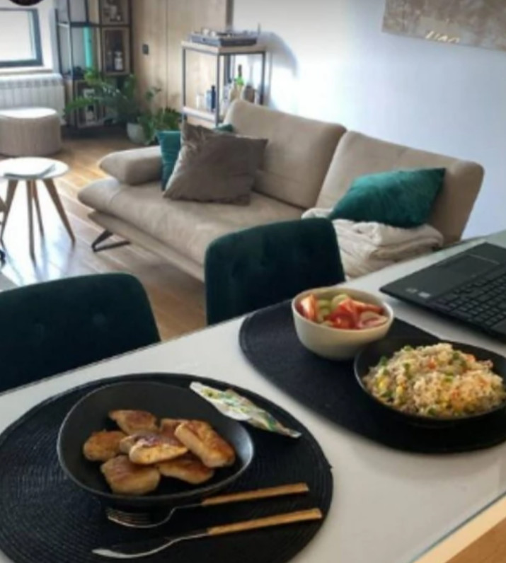 U dnevnom boravku dominiraju svetle nijanse, bela boja i siva, a u centralnom delu se nalazi ugaona garnitura i sto, kao i brojne police ispunjene knjigama.