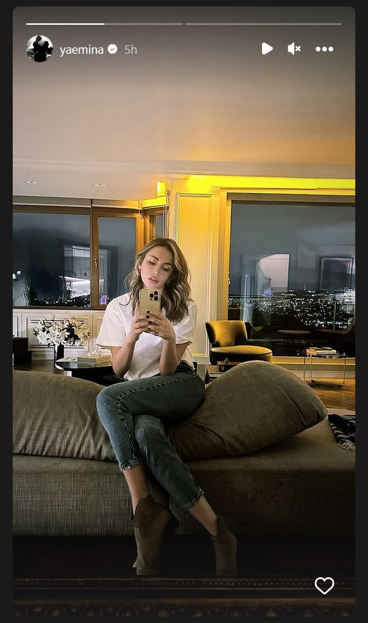 Pevačica Emina Jahović objavila je fotografiju iz svog doma, gde sedi na ogromnom krevetu u farkama, beloj majici i čini se čizmama.