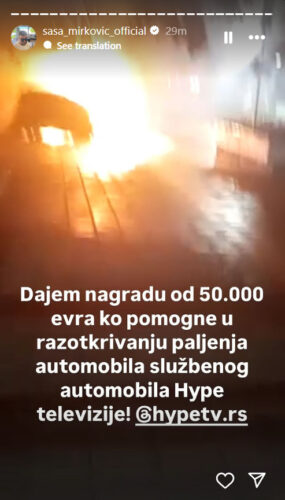 – Dajem nagradu od 50.000 evra ko pomogne u razotkrivanju paljenja službenog automobila Hype televzije! – napisao je Saša Mirković u svojoj objavi!