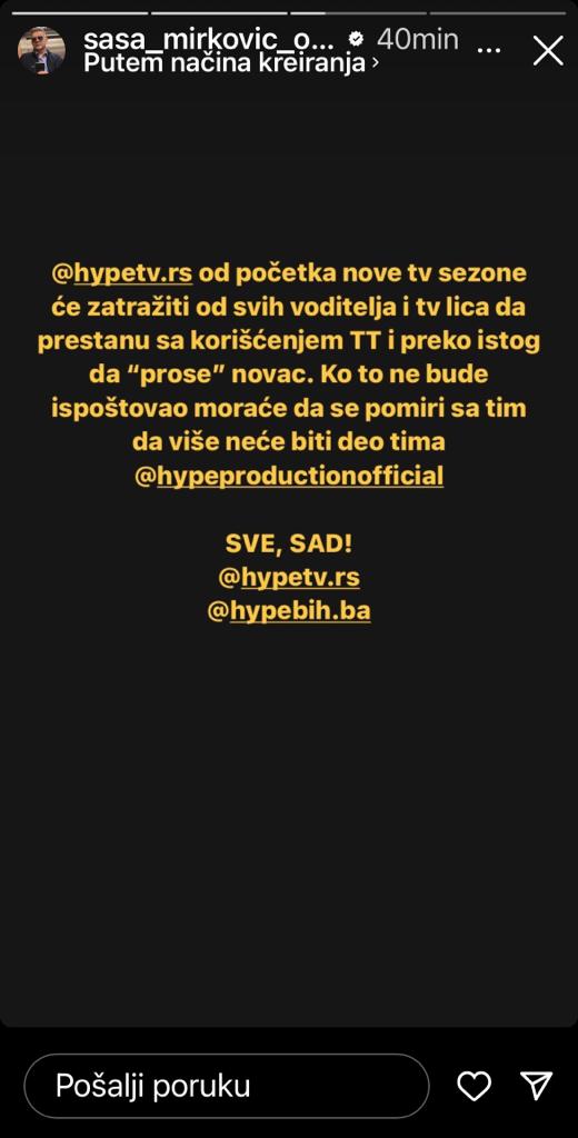 Glavni i odgovorni urednik i direktor Hype produkcije, Saša Mirković, danas je saopštio da će se od zaposlenh i TV lica u Hajpu tražiti da prestanu sa korišćenjem TikTok i preko istog da „prose“ novac.