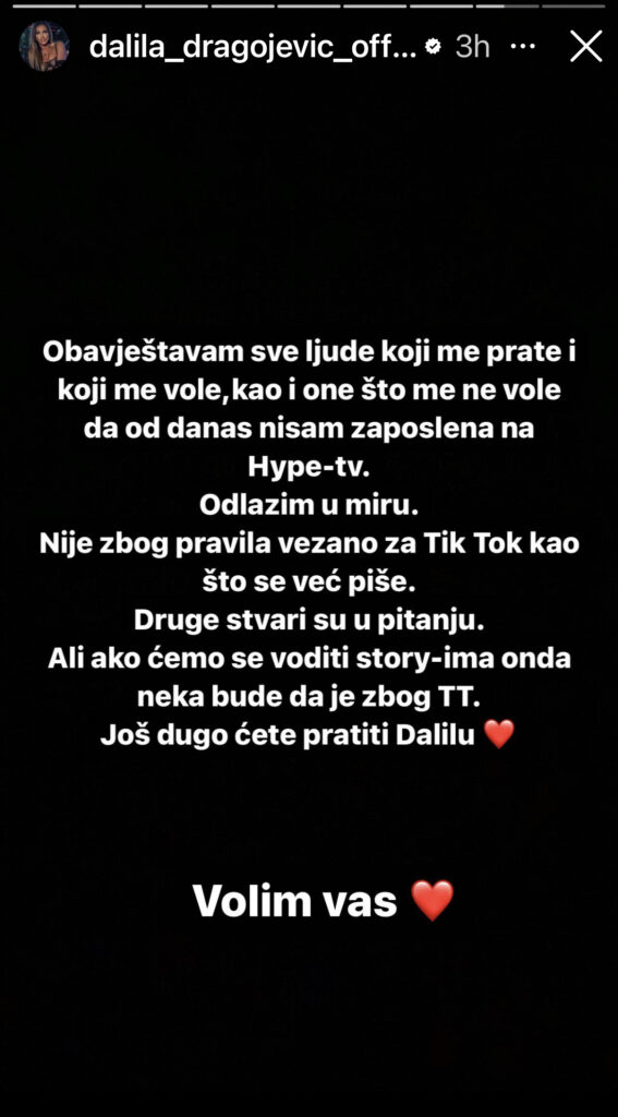 – Obaveštavam ljude koji me prate i koji me vole, kao i one što me ne vole, da od danas nisam zaposlena na televiziji Hype. Odlazim u miru. Nije zbog pravila vezana za Tik Tok kao što se već piše. Druge stvari su u pitanju. Ali ako ćemo se voditi storijima, onda neka bude da je zbog TT. Još dugo ćete pratiti Dalilu. Volim vas , napisala je Dalila.