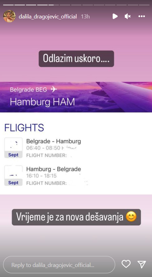 Ona je poruku gde se vidi da leti u Hamburg objavila na Instagramu.