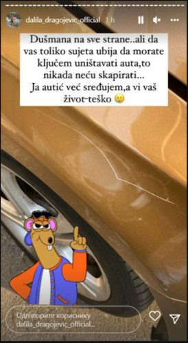 Dragojevićka je danas doživela napad, kad joj je nepoznata osoba ogrebala novi automobil, za koji je, kako se pričalo, dala pola svog zarađenog honorara u rijalitiju. Sve ovo je postavila na stori na društvenoj mreži Instagram, pa se obratila ljudima koji je ne vole.