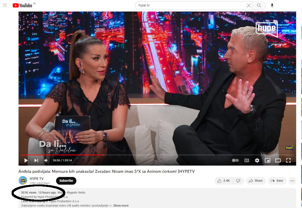 Pored ogromne gledanosti na YouTube, emisija je ostvarila i rekordnu gledanost na Hype tv kanalu, kao i u LIVE prenosu na našem Youtube.