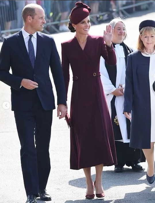 Za ovu priliku, Kejt je izabrala jednostavnu haljinu boje burgundija, sa dva zlatna dugmeta koja su izgledala drugačije u dnevnom svetlu u poređenju sa tamom katedrale.