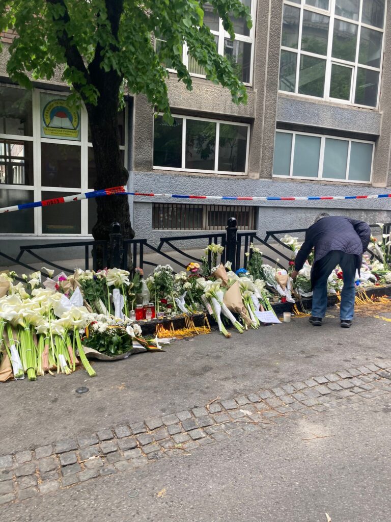 Ispred Osnovne škole „Vladislav Ribnikar“ na Vračaru, gde je pre 40 dana trinaestogodišnji dečak, uzimajući očev pištolj iz sefa, oduzeo živote svojih osam drugarica, drugara i čuvara škole D.V., građani se okupljaju kako bi u tišini i miru odali pomen tragično nastradalim đacima.