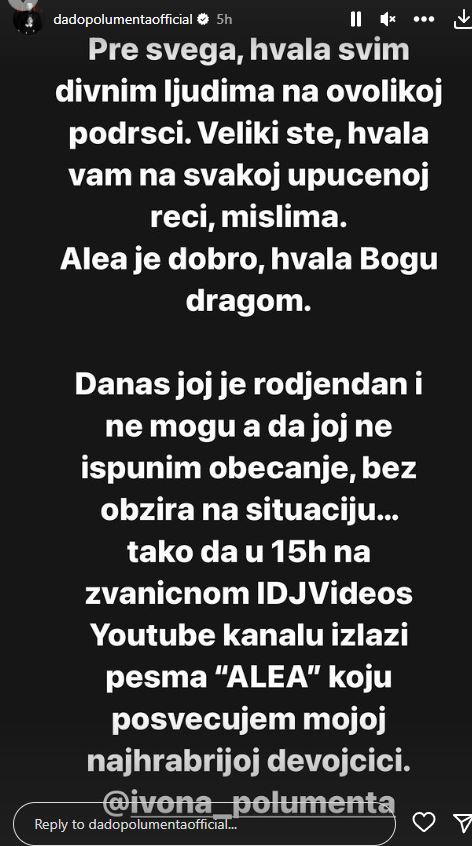 – Pre svega, hvala svim divnim ljudima na ovolikoj podršci. Veliki ste, hvala vam na svakoj upućenoj reči, mislim. Alea je dobro, hvala Bogu dragom. Danas joj je rođendan i ne mogu, a da joj ne ispunim obećanje, bez obzira na situaciju, tako da u 15h na zvaničnom IDJVideos kanalu izlazi pesma „Alea“ koju posvećujem mojoj najhrabrijoj devojčici – napisao je Dado, a potom se oglasila i njegova supruga Ivona.