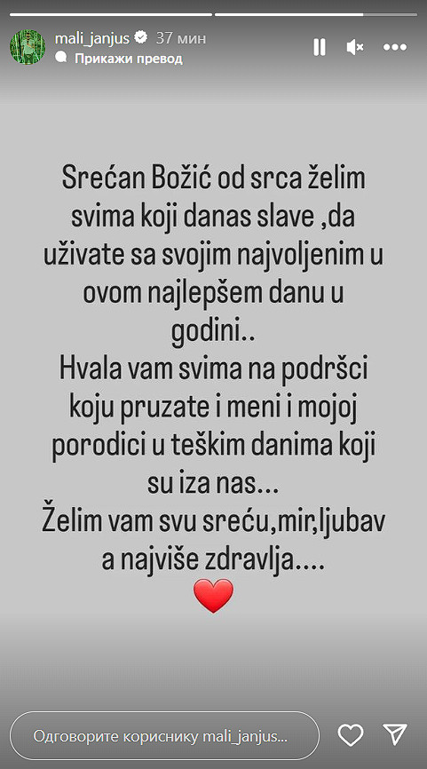 – Srećan Božić od srca želim svima koji danas slave da uživate sa svojim najvoljenijima u ovom najlepšem danu u godini.. Hvala svima na podršci koju pružate i meni i mojoj porodici u teškim danima koji su iza nas… Želim vam svu sreću, mir, ljubav, a najviše zdravlja… – napisao je Janjuš uz emotikon srca.