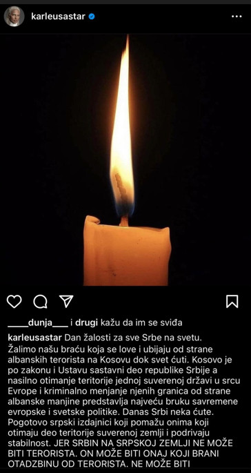 – Dan žalosti za sve Srbe na svetu. Žalimo našu braću koja se love i ubijaju od strane albanskih terorista na Kosovu dok svet ćuti. Kosovo je po zakonu i Ustavu sastavni deo Rrepublike Srbije, a nasilno otimanje teritorije jednoj suverenoj državi u srcu Evrope i kriminalno menjanje njenih granica od strane albanske manjine predstavlja najveću bruku savremene evropske i svetske politike. Danas Srbi neka ćute. Pogotovo srpski izdajnici koji pomažu onima koji otimaju deo teritorije suverenoj zemlji i podrivaju stabilnost. Jer Srbin na na srpskoj zemlji ne može da bude terorista.