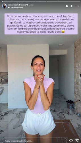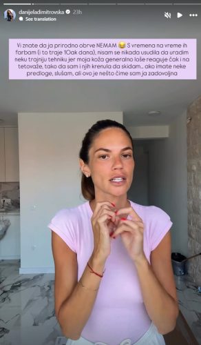 „Vi znate da ja prirodno obrve nemam. S vremena na vreme ih farbam i to traje 10ak dana, nisam se nikada usudila da uradim neku trajnu tehniku jer moja koža generalno loše reaguje čak i na tetovaže, tako da sam i njih krenula da skidam. Ako imate neke predloge, slušam“, napisala je Danijela u storiju.