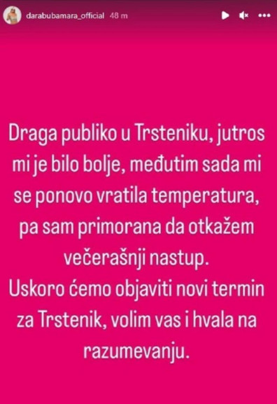 – Draga publiko u Trsteniku, jutros mi je bilo bolje, međutim, sada mi se ponovo vratila temperatura, pa sam primorana da otkažem večerašnji nastup. Volim vas i hvala na razumevanju – napisala je Dara.