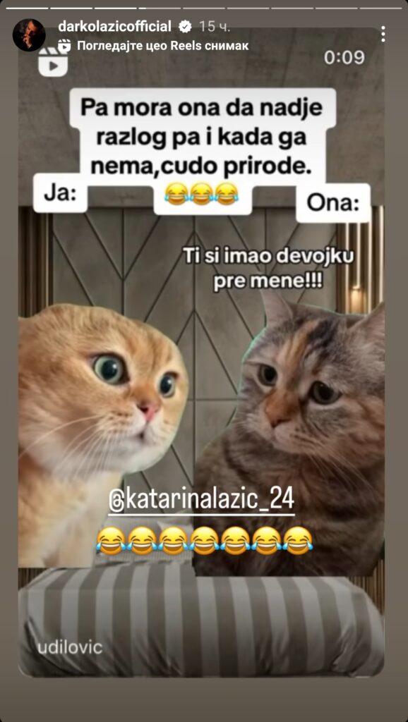 Sada je Darko na svom Instagram profilu podelio smešan mim mačaka koje se raspravljaju, pa je na tom videu označio svoju suprugu Katarinu Lazić.
