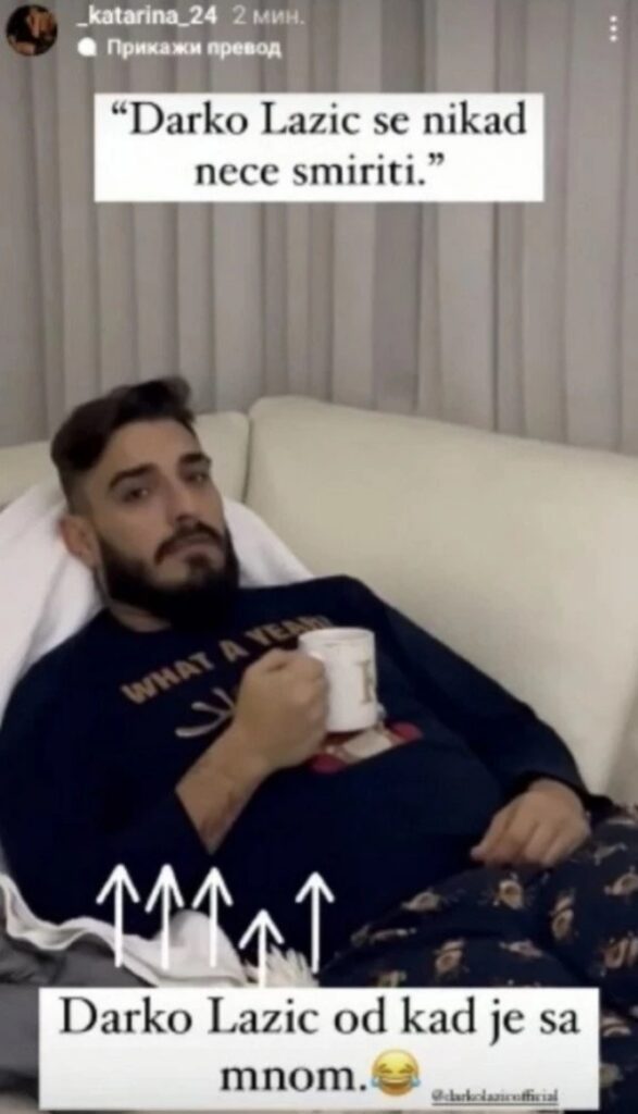 Kaća je pokazala kako Darko leži u dnevnom boravku u prazničnoj odeći, te gleda TV dok pije piće iz šolje. Nakon što su mnogi poverovali u sve ovo, Katarina je raskrikala Darka u narednom storiju, pa se ispostavilo da folker ne pije čaj, već viski, što je nasmejalo sve. Ova njena objava pokrenula je veliki broj komentara, dok je Darko u više navrata javno pričao koliko se promenio pored Kaće.