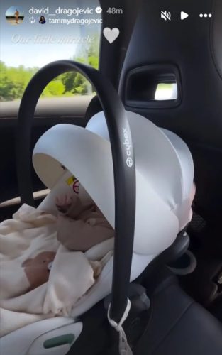 U svom storiju je takođe podelio odnosno repostovao objavu svoje supruge koja je okačila snimak bebice na zadnjem sedištu u kolima što je bio znak da je porodica krenula put svoje kuće.