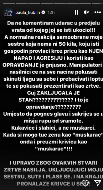 – I upravo zbog ovakvih stvari žrtve nasilja, uključujući moju sestru, ćute i plaše se i na kraju pronalaze krivce u sebi – zaključila je Paula Hublin na svom Instagram profilu.