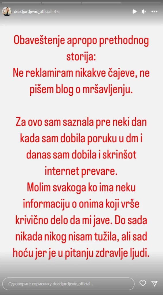 – Obaveštenje apropo prethodnog storija: Ne reklamiram nikakve čajeve, ne pišem blog o mršavljenju. Za ovo sam saznala pre neki dan kada sam dobila poruku na Instagram profilu i danas sam dobila i skrinšot internet prevare. Molim svakoga ko ima neku informaciju o onima koji vrše krivično delo da mi jave. Do sada nikada nikoga nisam tužila, ali sad hoću jer je u pitanju zdravlje ljudi – napisala je Dea.