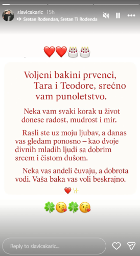 „Voljeni bakini prvenci, Tara i Teoodre, srećno vam punoletstvo. Neka vam svaki korak u životu donese radost, mudrost i mir. Rasli ste uz moju ljubav a danas vas gledam ponosno – kao dvoje divnih mladih ljudi sa dobrim srcem i čistom dušom. Neka vas anđeli čuvaju, a dobrota vodi. Vaša baka vas voli beskrajno“, piše u objavi u okviru Slavičinog Instagram storija.