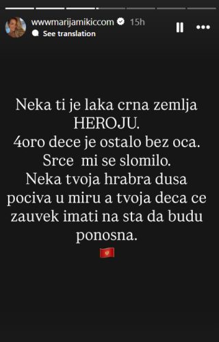 – Neka ti je laka crna zemlja heroju. Četvoro dece je ostalo bez oca. Srce mi se slomilo. Neka tvoja hrabra duša počiva u miru, a tvoja deca će zauvek imati na sta da budu ponosna – napisala je Marija Mikić.