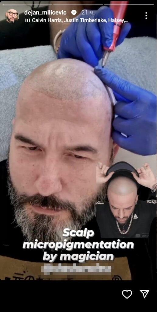 Dejan je na svom Instagram nalogu sa svojim pratiocima podelio snimak procesa mikropigmentacije skalpa. Naime mikropigmentacija skalpa predstavlja jedan od načina kamuflaže gubitka kose.
