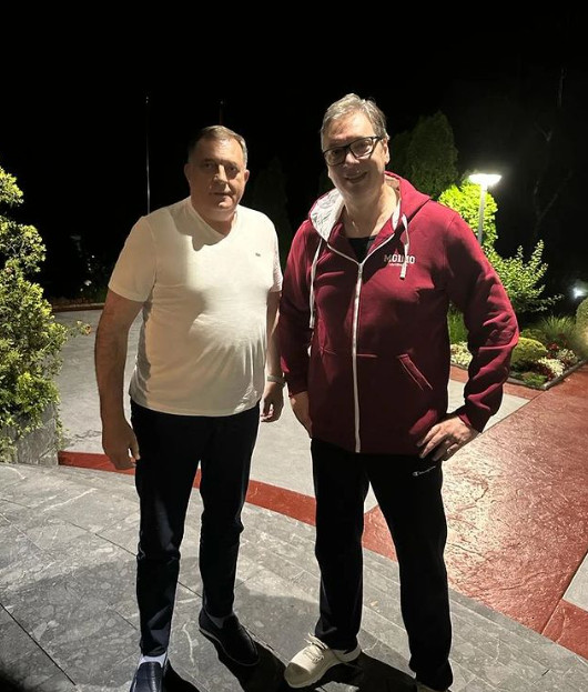 Predsednici Srbije i Republike Srpske Aleksandar Vučić i Milorad Dodik večeras zajedno prate prenos košarkaške utakmice plej ofa Aba lige, između Crvene zvezde i Partizana.