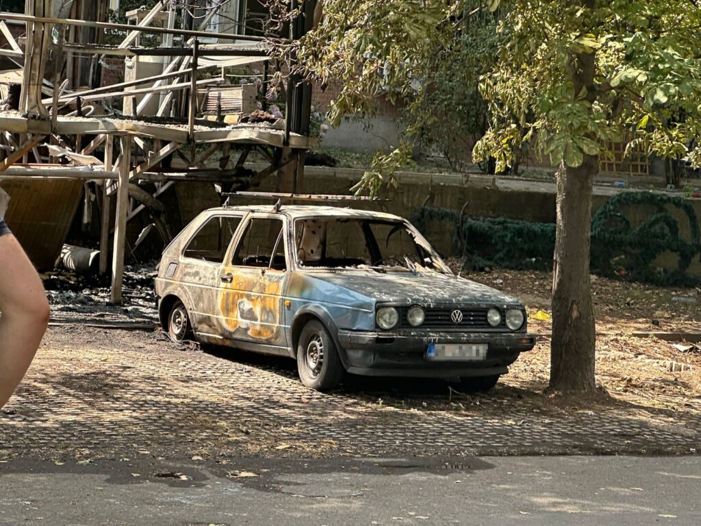 Jedan uništeni automobil nalazi se ispred kafića, gde je veliki broj pripadnika policije i vatrogasaca.