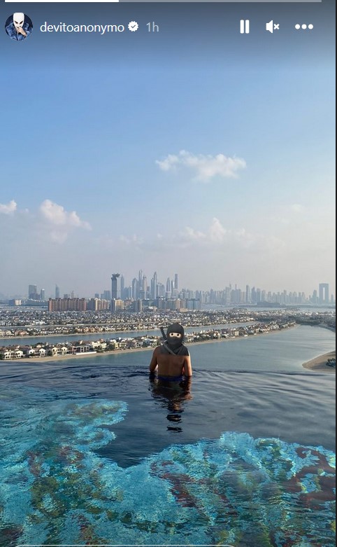 On na svom Instagramu kači slike isključivo na kojima nosi masku, međutim, danas se desio šok potez koji je iznenadio sve njegove brojne fanove. Naime, Devito je otišao u Dubai, gde boravi u luksuznom hotelu, a detalje svog odmora kači na svom profilu na Instagramu. On je danas pozirao na ivici bazena koji ima pogled na grad, a preko svog lica je stavio stiker, jer očigledno na svom odmoru ne nosi masku, pogotovo dok je u bazenu.