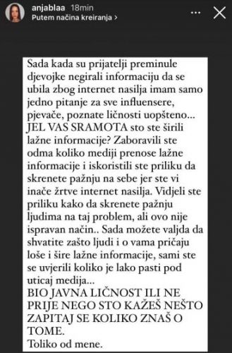 -Sada kada su prijatelji preminule devojke negirali informaciju da se ubila zbog internet nasilja, imam samo jedno pitanje za influensere, pevače, poznate ličnosti: Jel vas sramota što ste širili lažne informacije? Zaboravili ste odmah koliko mediji prenose lažne informacije i iskoristili ste priliku da skrenete pažnju na sebe jer ste vi žrtve internet nasilja – oštra je bila Anja Blagojević.