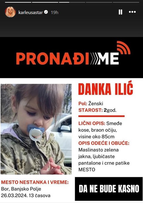Dvogodišnja devojčica Danka Ilić nestala je u utorak popodne u Banjskom polju kod Bora. Tada se po prvi put u Srbiji aktivirao sistem „Pronađi me“, popularno nazvan „Amber alert“.