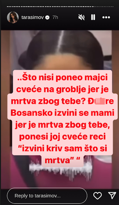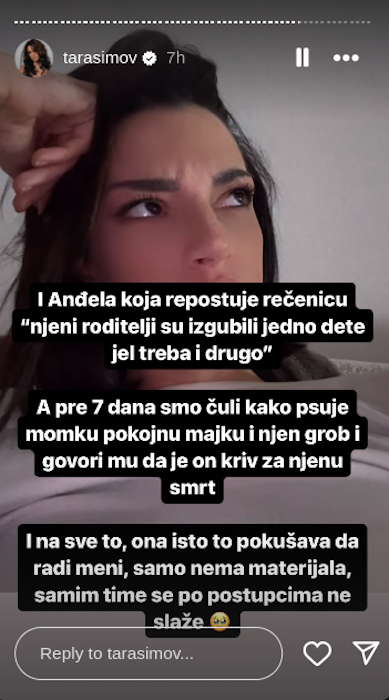 – Anđela koja repostuje rečenicu „njeni roditelji su izgubili jedno dete, jel treba i drugo“, a pre sedam dana smo čuli kako psuje momku pokojnu majku i njen grob i govori mu da je on kriv za njenu smrt. I na sve to, ona isto to pokušava da radi meni, samo nema materijala, samim tim se po postupcima ne slaže – napisala je Tara Simov na svom Instagram storiju.