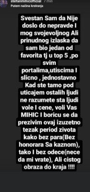 – Svestan sam da nije došlo do nepravde i mog svojevoljnog ali prinudnog izlaska da sam bio jedan od favorita tj. u top 5, po svim portalima, utiscima i slično. Jednostavno kad ste tamo tamo pod uticajem drugih ljudi ne razumete šta ljudi vole i cene, voli Vas Mihić i boriću se da preživim ovaj izuzetno težak period života kako bez para (bez honorara sa kaznom), tako i bez odeće (neće da mi vrate), ali čistog obraza do kraja.
