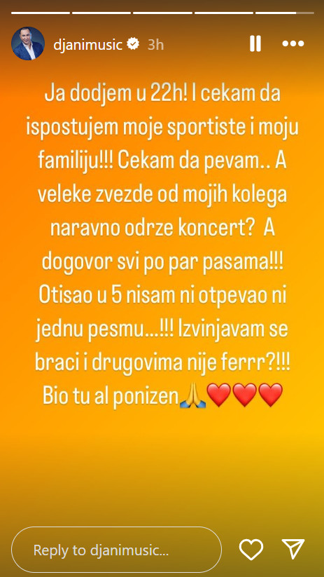 – Ja dođem u 22h i čekam da ispoštujem moje sportiste i moju familiju!!! Čekam da pevam… A velike zvezde od mojih kolega naravno održe koncert? A dogovor svi po par pasama!!! Otišao u 5, nisam ni otpevao nijednu pesmu!!! Izvinjavam se braći i drugovima, nije fer!!! Bio tu, al’ ponižen„, stoji u Đanijevom storiju na Instagramu.
