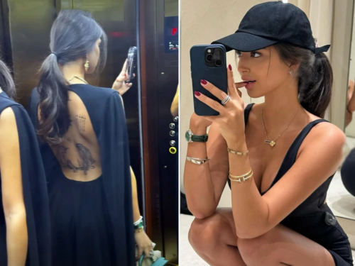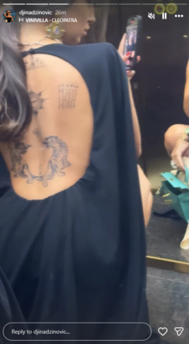 Na slici ispred ogledala, Đina pozira u elegantnoj crnoj haljini sa potpuno otvorenim leđima, a ono što je svima zapalo za oko jesu tetovaže sa motivom dva velika tigra.
