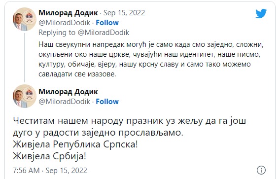 „Naš sveukupni napredak moguć je samo kada smo zajedno, složni, okupljeni oko naše crkve, čuvajući naš identitet, naše pismo, kulturu, običaje, veru, našu krsnu slavu i samo tako možemo savladati sve izazove. Čestitam našem narodu praznik uz želju da ga još dugo u radosti zajedno proslavljamo. Živela Republika Srpska! Živela Srbija!“, poručio je Dodik.