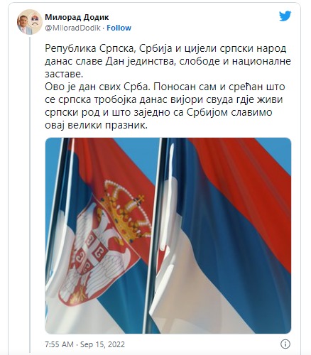 Srpski član Predsedništva BiH Milorad Dodik čestitao je Dan srpskog jedinstva, slobode i nacionalne zastave, ističući da je danas dan svih Srba.
