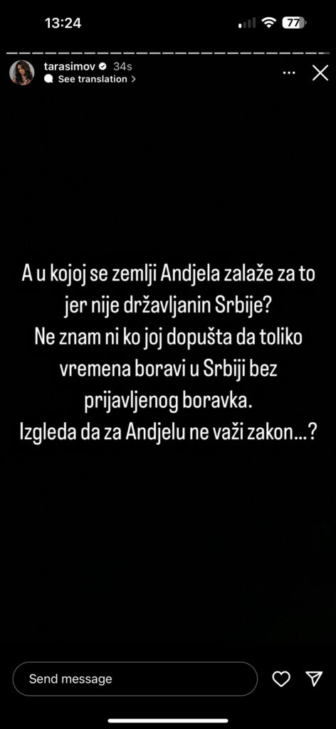 “A u kojoj se zemlji Andjela zalaž za to jer nije državljanin Srbije? Ne znam ni ko joj dopušta da toliko vremena boravi u Srbiji. Bez prijavljenog boravka. Izgleda da za Andjelu ne važi zakon…?” pitala se Simova koja je izrevoltirana. Nakon što je Anđela pre nekog vremena javno pominjala njeno dete na TikTok lajvu prozivajući je nemajkom.