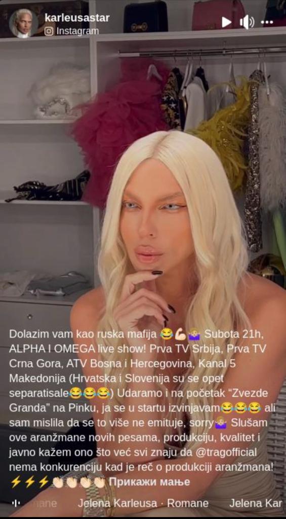 – Dolazim vam kao ruska mafija. Alfa i Omega lajv šou, subota 21 čas. Udaramo i na početak emisije „Zvezde Granda“ na TV Pink, ja se u startu izvinjavam, ali sam mislila da se to ne emituje, sori. Slušam ove aranžmane novih pesama, produkciju, kvalitet i javno kažem ono što već svi znaju, moji saradnici nemaju konkurenciju – poručila je JK i ponovo potkačila „Zvezde Granda“, ali ne samo pomenuti format, već i Sašu Popovića kao jednog od kreatora, Željka Mitrovića kao vlasnika Pink imperije, ali i Cecu Ražnatović kao jednu od članova žirija ovog takmičenja.