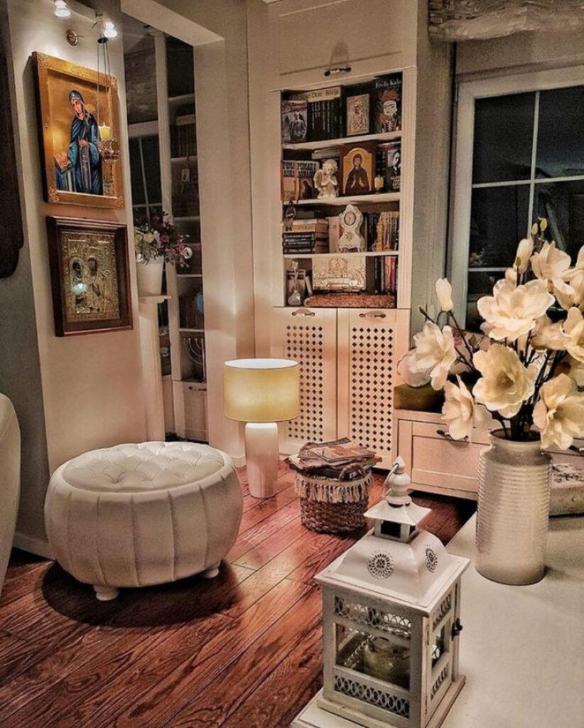 U dnevnoj sobi nalaze se police sa mnoštvom knjiga, fotografijama i ikonama. Tu su sveće i cveće koje dodatno doprinose na atmosferi topline.