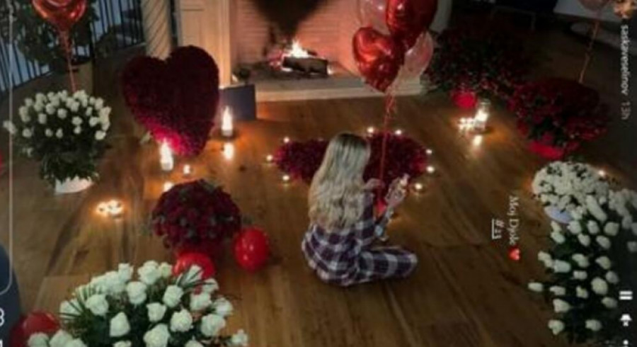 Dnevnu sobu je ukrasio buketima crvenih i belih ruža, a svuda okolo su bile upaljenje ukrasne sveće, kao i baloni u obliku srca.