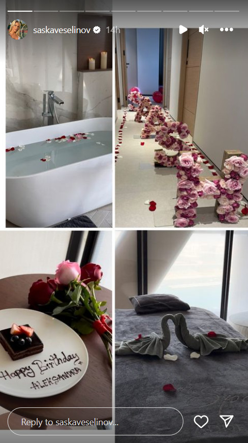 Zatim je za mladu influenserku usledilo pravo iznenađenje u sobi. Naime, nju je već u hodniku dočekao aranžman od ruža koje su ispisivale njeno ime, a potom je usledio romantični užitak u kadi napunjenoj vodom i laticama ruža, da bi je suprug ona suprug oduševio i kolačem i buketom cveća.