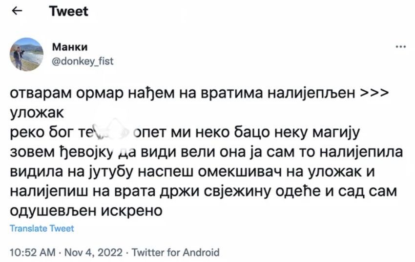 – Otvaram ormar nađem na vratima nalepljen – uložak. Rekoh bog te j*** opet mi neko bacao neku magiju…