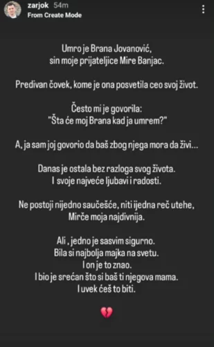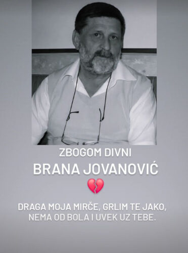 – Umro je Brana Jovanović, sin moje prijateljice Mire Banjac. Predivan čovek, kome je ona posvetila ceo svoj život. Često mi je govorila: „Šta će moj Brana kad ja umrem? – napisao je Jokanović na Instagramu i dodao:
