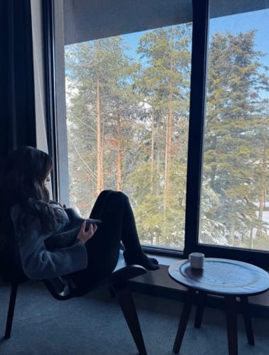 Slikala se dok gleda prirodu sa prozora, a pozirala je sa nogama podignutim na stolicu.
